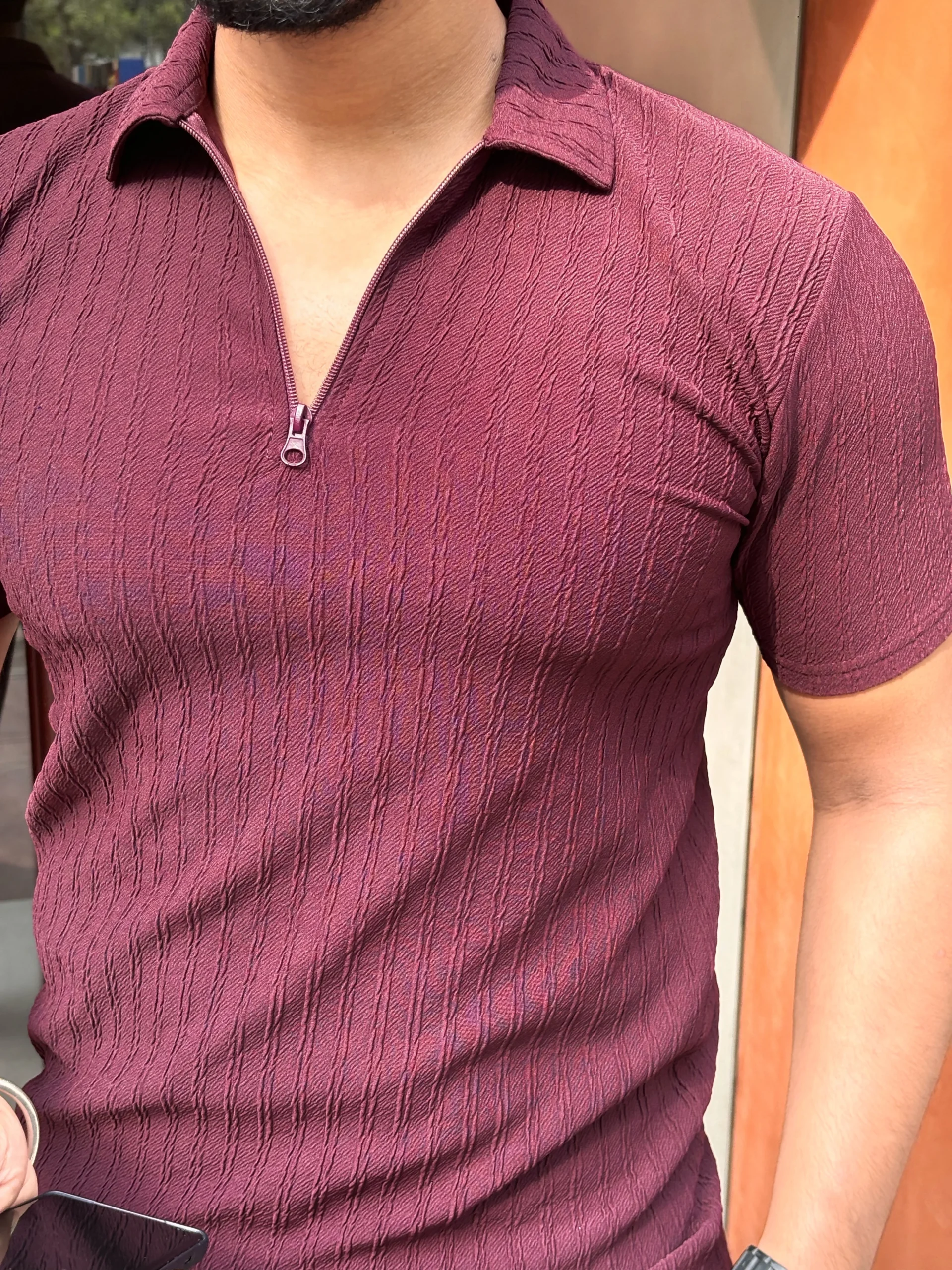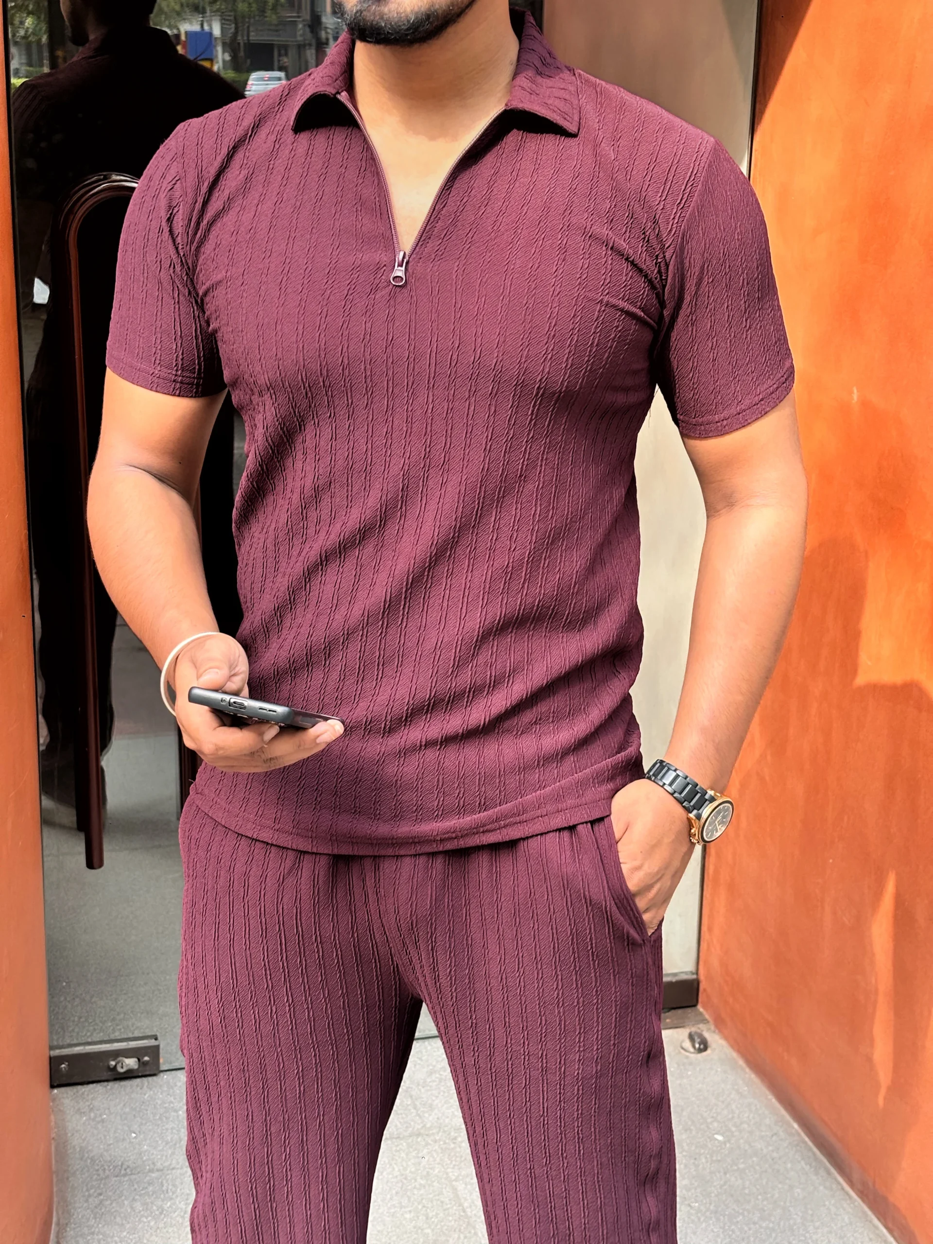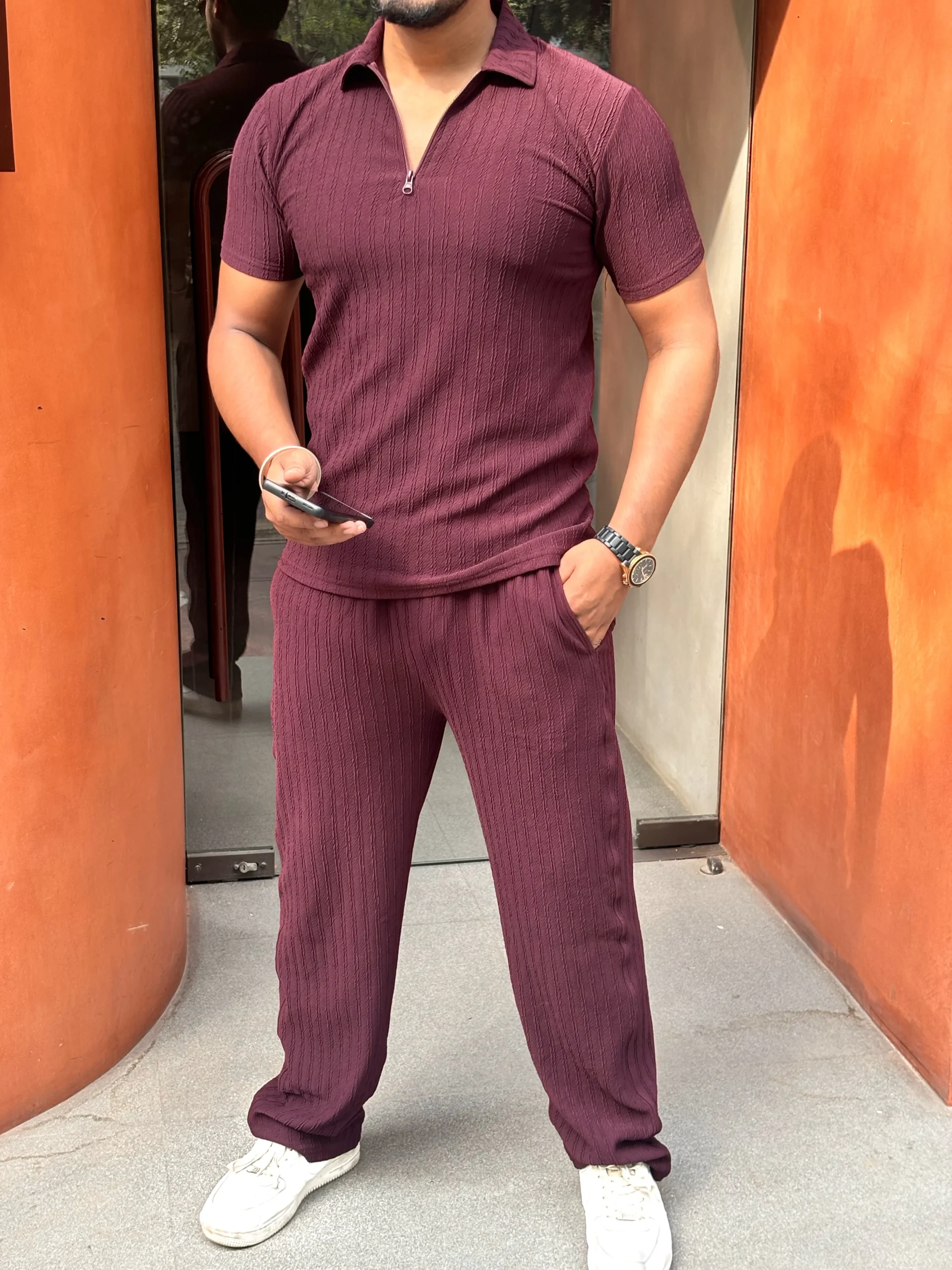 UA HALF ZIPPER T-SHIRT & PANTS TEXTURED CO-ORD SET MEN – WINE