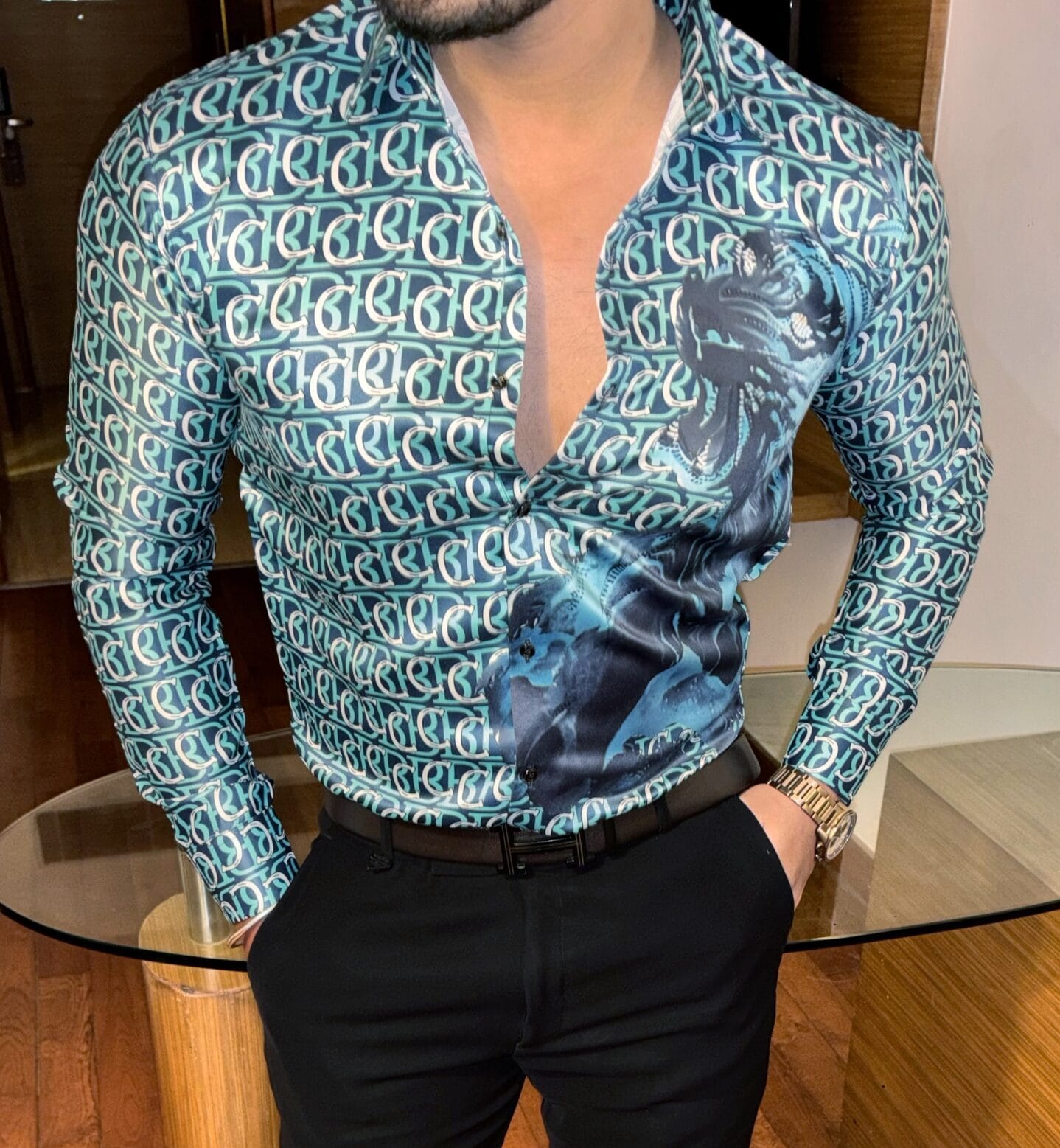 The intricate detailing of the feline design paired with a sleek modern fit makes this shirt a showstopper for festive gatherings, parties, or casual outings. Whether paired with tailored trousers or your favorite denim, this shirt adds an undeniable charm to your wardrobe.
